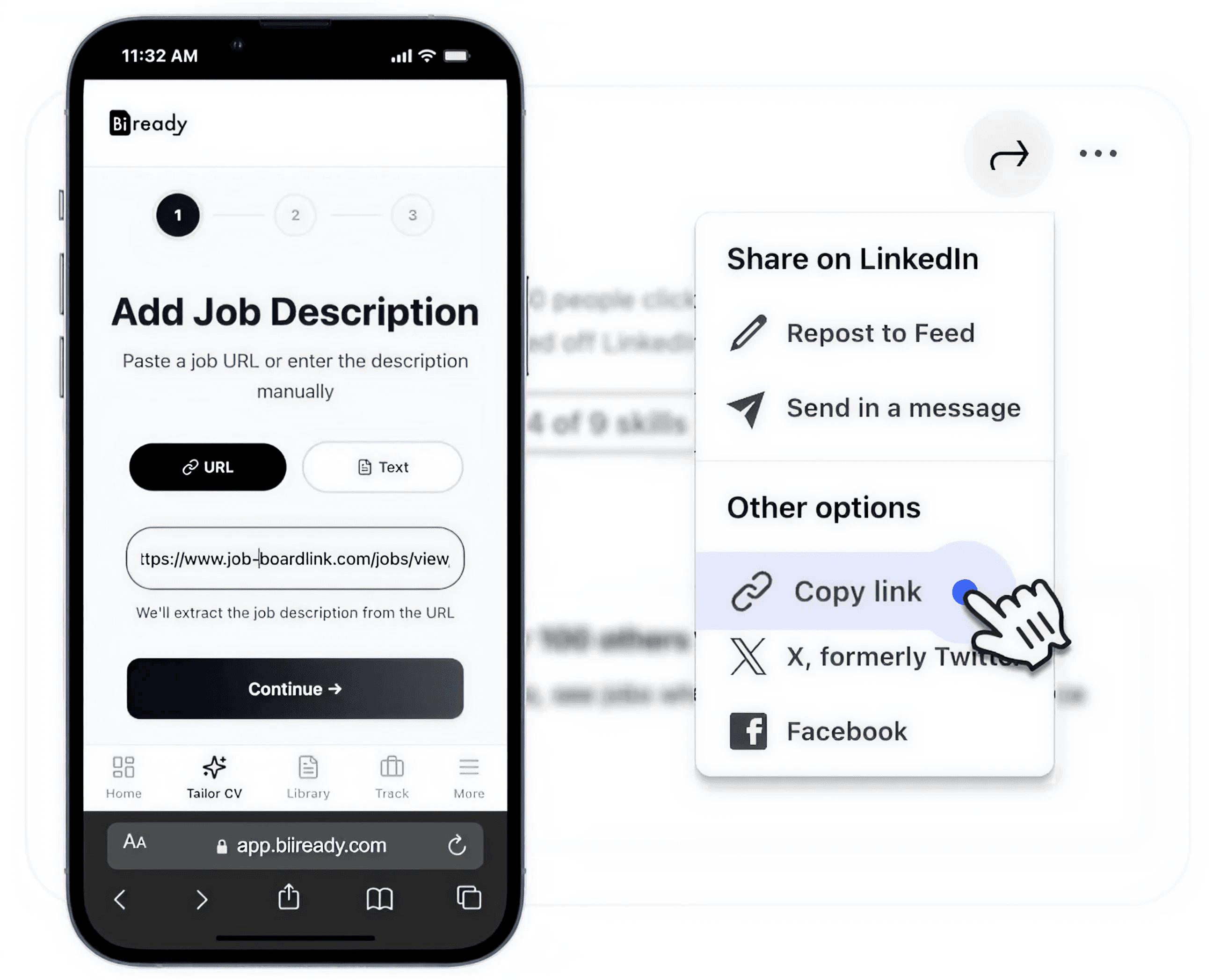 Paste a job link, upload your CV, and get a tailored CV, cover letter, and interview prep & application tracking saved in one place.