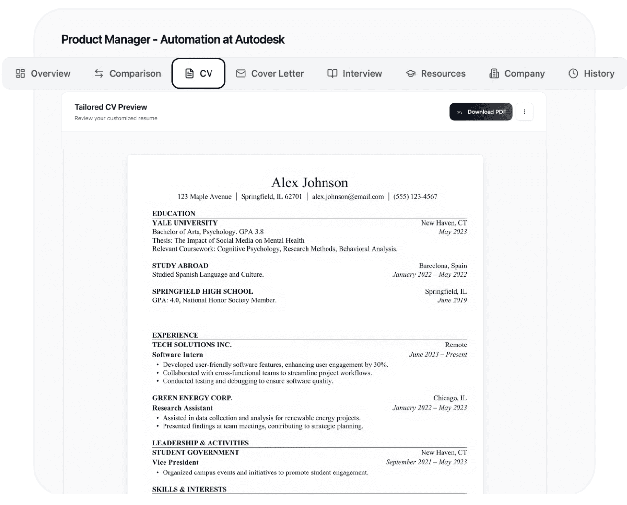We’ll tailor your CV to the role, create a role specific cover letter, and compile interview prep based on the company and description all in one place.